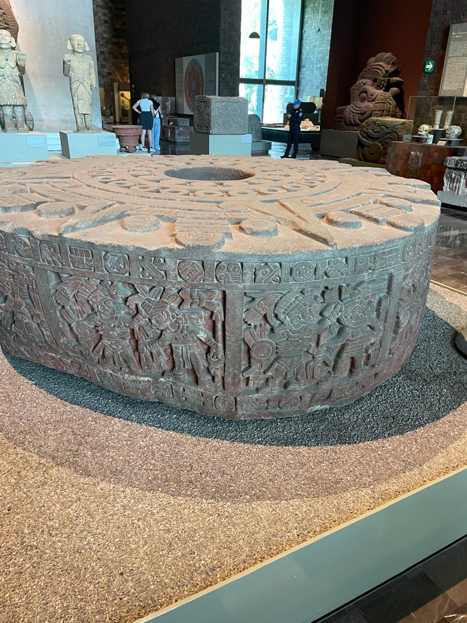 “Dijo el rey Axayaca á Cihuacoatl Tlacaeleltzin un día: Señor y padre, mucho quisiera que renovásemos la piedra redonda que está por brasero y degolladero arriba de la casa y templo de tetzahuitl Huitzilopochtli, ó si os parece, que se labre otro mayor de mejores labores, y el que ahora está sirva para otro templo de Dios…Quisiera que la piedra que está ahora encima del Cú, por haberla labrado el rey mi señor Moctezuma, que no vaya á parte ninguna, sino que muy bien encalada se ponga abajo del gran Cú. Hecho esto se puso en lo alto del Cú, frontero de la casa del Huitzilopochtli.” (Tezozómoc, pp. 625, 626).